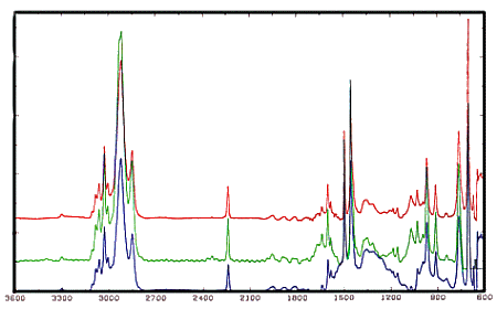 Infrared spectroscopy is one tool of choice for the identification of organic based materials and a few inorganic compounds. A beam of infra-red radiation is directed through the specimen. Specific bonds in the molecules of the sample will absorb radiation from the beam at certain frequencies or wavelengths causing them to oscillate faster. These absorptions ("IR absorbance bands") show up as deflections from the baseline and can be assigned to specific groupings of atoms; e.g., C-H, C=O. In many cases, identification of a material can be made based on |