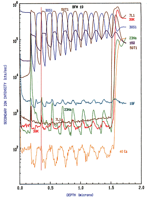 As mentioned above, there are 2 types of SIMS. Dynamic SIMS (D-SIMS) is used mainly for inorganic materials with layers to be analyzed that are at least a few nm's thick. The ion beam current is typically a few nA. Static SIMS (S-SIMS) by contrast uses a beam of a few pA. It is used for very thin layers or very delicate materials, especially organic compounds. Because of the relatively delicate nature of the beam, organic compounds come off in molecular fragments rather than just the atoms. Thus organic compounds, or at least organic families, even in very thin layers can be identified. Time - of - flight SIMS (TOF-SIMS) is a cross between D - and S-SIMS using a field emission metal ion beam (usually Cs) for good areal resolution, TOF sorting for very high mass resolution and moderately weak ion currents for near S-SIMS sputter rates and ability to analyze organic materials. Its weakness is its strength - it generates too much data for many applications and so must be used judiciously.
